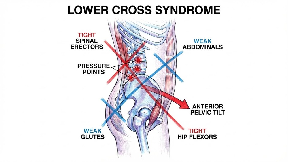 Lower Cross Syndrome is a muscular imbalance in your lower body. It happens when certain muscles become tight while others become weak. Think of it as a tug-of-war in your pelvis.